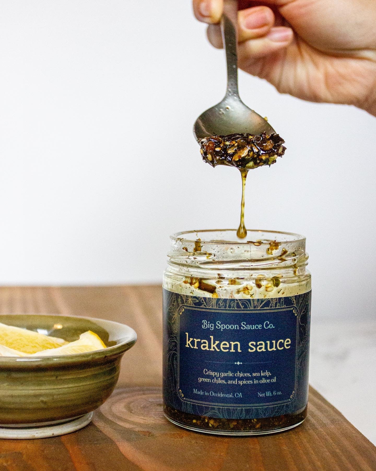 This funky deep green chili crisp has the most delightfully aromatic olive oil infused with extra fragrant garlic chives, paired with a satisfying heat thanks to a combo of local jalapeño and poblano peppers. The foraged kombu and nori get jiggy with the other power players like garlic, dill, cardamom, Sichuan peppercorns, sesame seeds, and ginger to make this a one-of-a-kind chili crisp with strong furikake vibes.
