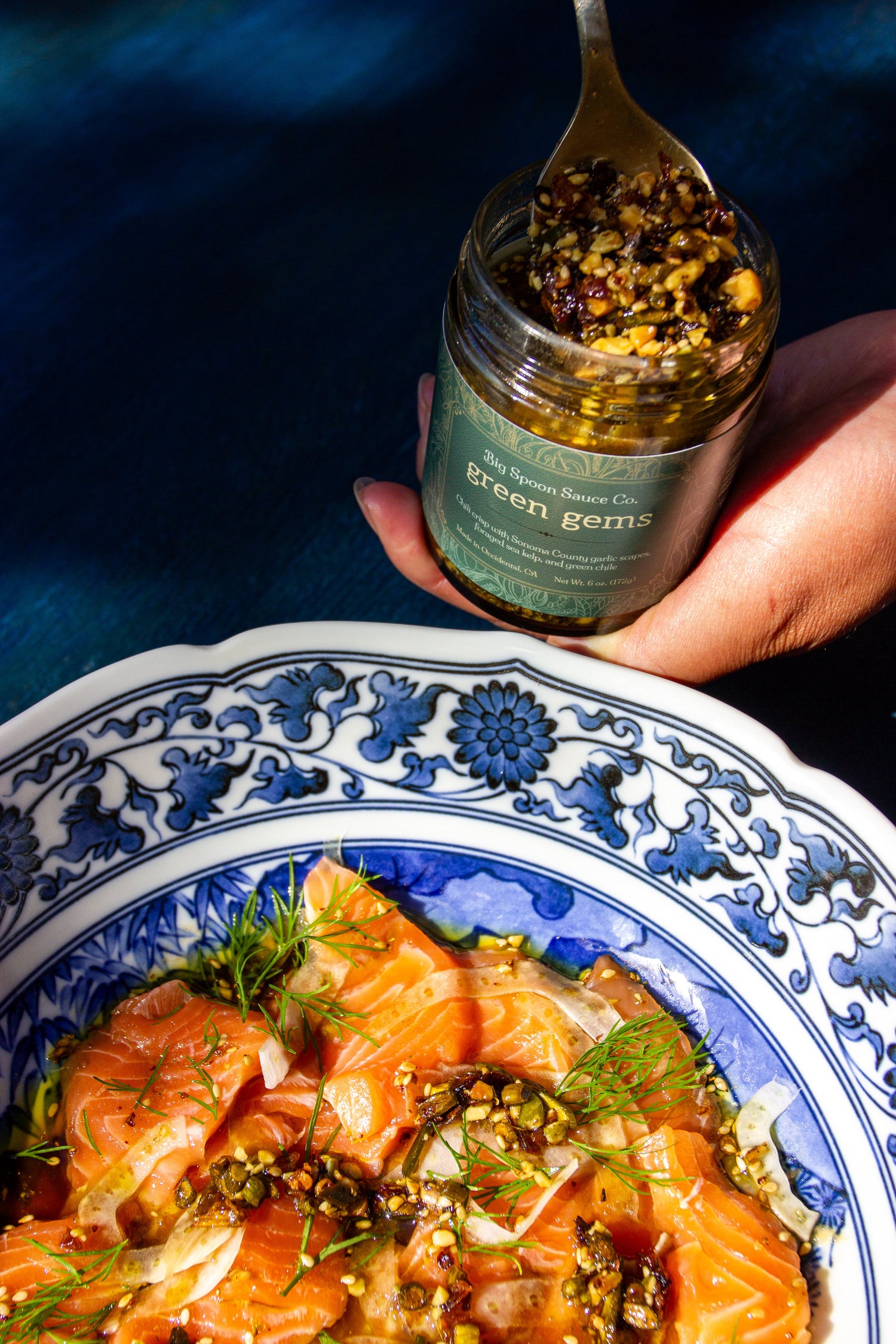 Garlic scapes, the sweet tender stems that flower from hard neck garlic varieties, make a fleeting appearance at the farmers market every spring. One market in May we bought all the scapes that Tom at Armstrong Valley Farm had left at the end of the day and our green chili crisp dreams came true. We chopped up all the garlic scapes (which, given how curly and unwieldy they can be, is a gnarly prep task), crisped them up, and snuggled them in with our stash of foraged sea kelp straight out of Bodega Bay. Green Sichuan peppercorns, fennel, fried shallots, and peanuts rounded it out to make Green Gems. It’s a jar of springtime treasures from our very own Sonoma Coast. It tastes like a mermaid snack and we will 100% be making this again.